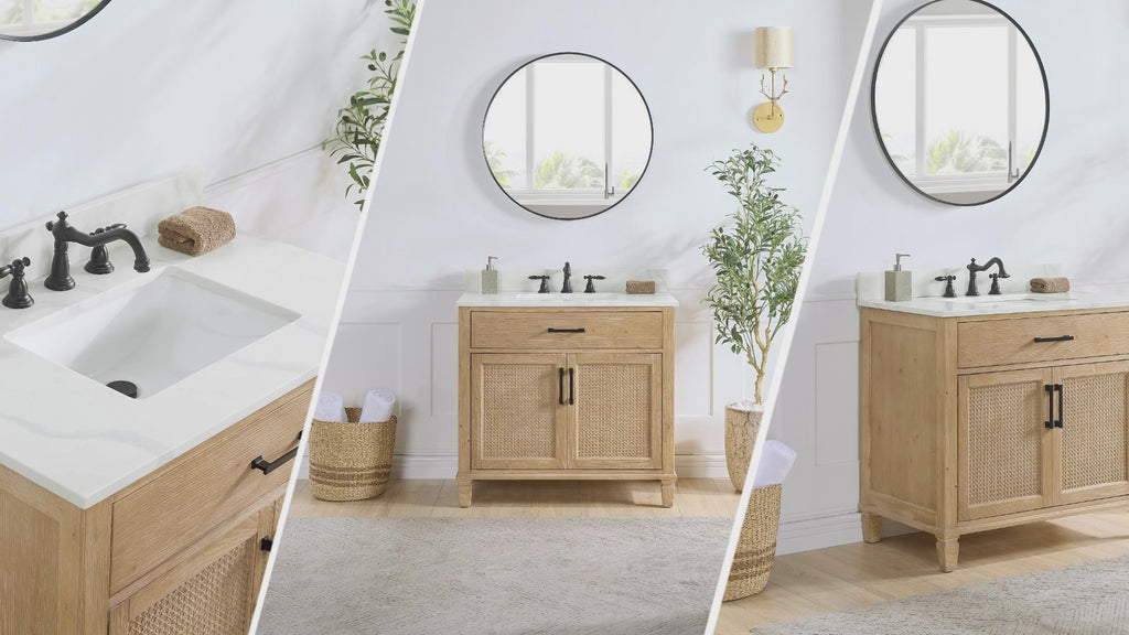 Whether in your beach house or year-round dwelling, Solana vanity has a coastal sensibility that brings a touch of the ocean to any bathroom space. Natural cane rattan webbing accentuates the cabinet fronts, while the distressed wood finish lends a soothing, relaxed vibe, set off by the bold brightness of the stone countertop. Genuine fir and spruce wood materials add a warm, natural, and organic essence to this piece, with variations in texture and color that give it inviting character and seaside charm.